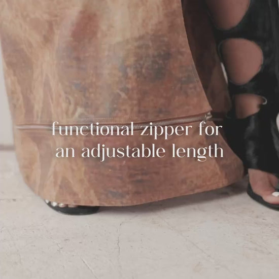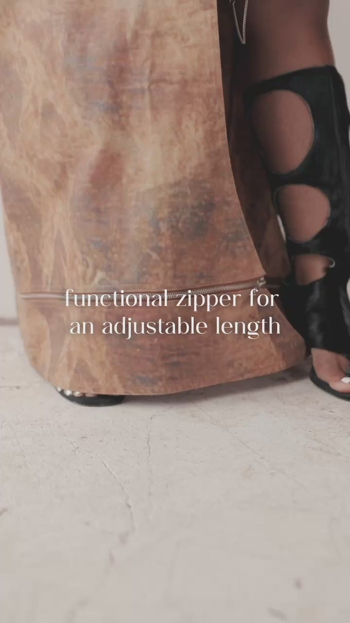Designed with intention, this structured waxed denim skirt redefines versatility. Featuring a slanted waistline for a bold, modern edge and an adjustable waistband for a customized fit, this piece moves with you. A functional zipper at the bottom allows you to transform the length—style it your way, from daytime polish to evening statement.
